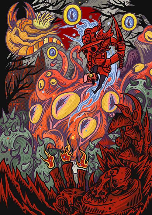 站酷知名插画师癫灵为大家带来了《克苏鲁与寄生体》。小植物、枯木、红月,以及生长着很多眼睛的寄生体,将克苏鲁的氛围烘托得淋漓尽致。