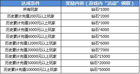 累计充值感恩回馈分为两波,第一弹从1月25日0:00至1月30日23:59,玩家历史累计充值金额达到相应金额,即可领取对应钻石奖励,最多可达113000,一夜暴富不再是梦!