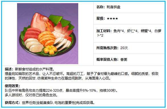以上就是小编为大家带来的"《原神》刺身拼盘怎么获得 刺身拼盘食谱配方及功效一览"全部内容了,更多资讯请关注te5.cn。