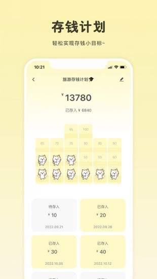 趣味记账存钱小助手,养成良好的理财习惯。丰富的存钱模式,帮助你实现每个小心愿,趣味记账,每天记账奖励鲜花,相同的鲜花可以合成更多美丽的花朵哦,每天的收支情况一目了然!