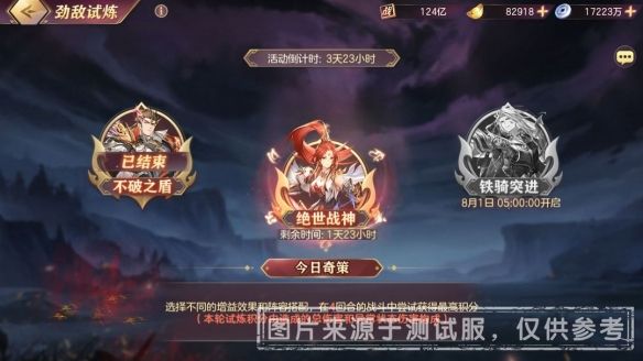 1、全新策略性首领挑战玩法【劲敌试炼】登场!在活动的第1日,第3日,第5日将分别开启【不破之盾、绝世战神、铁骑突进】3个阶段的挑战。