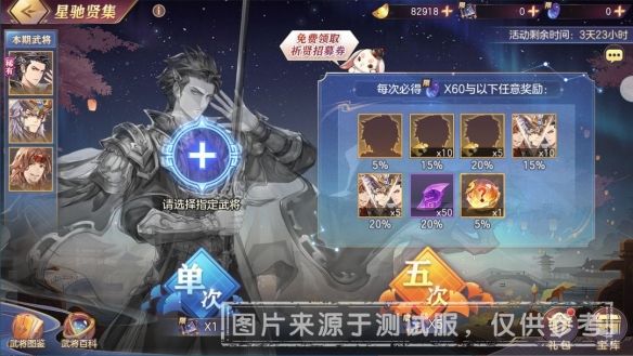1、在【星驰贤集】活动中,小将军们可以选定“曹丕、马超、吕蒙”并消耗活动限定道具「祈贤招募券」进行招募,选择的武将会和其他材料一并进行抽取。